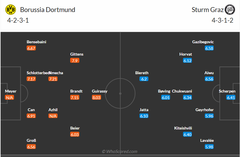 Dortmund thắng 2, thua 1 sau 3 lượt trận tại Champions League, đây không phải thành tích tệ và vị trí mà đội bóng nước Đức đang có vẫn là rất ổn. Trân thua ở lượt đấu trước nằm trong chuỗi 3 trận thua liên tiếp của Dortmund, tuy nhiên đội bóng của HLV Nuri Sahin đã có chiến thắng ở trận gần nhất, chiến thắng trước đội nhì bảng Bundesliga Leipzig giúp các cầu thủ Dortmund tự tin hơn khi trở lại đấu trường Champions, nơi họ cần có 3 điểm để có nhiều cơ hội giành vé đi tiếp hơn. Trước đối thủ yếu hơn nhiều như Sturm Graz thì nhiều khả năng đội bóng chủ nhà sẽ không gặp nhiều khó khăn để có được chiến thắng.